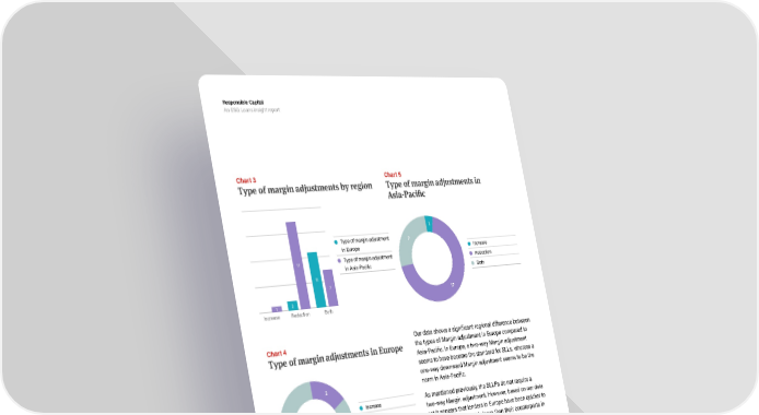 Responsible Capital An ESG Loans insight report Chart 3 Chart 5 Type of margin adjustments by region Type of margin adjustments in Asia-Pacific 1 Type of margin adjustment 7 in Europe Increase 17 Type of margin adjustment Reduction in Asia-Pacific 11 Both 7 2 17 1 4+69+27+F Increase Reduction Both Chart 4 Our data shows a significant regional difference between Type of margin adjustments in Europe the types of Margin adjustment in Europe compared to Asia-Pacific. In Europe, a two-way Margin adjustment seems to have become the standard for SLLs, whereas a one-way downward Margin adjustment seems to be the 2 norm in Asia-Pacific. Increase As mentioned previously, the SLLPs do not require a Reduction two-way Margin adjustment. However, based on our data Both set it appears that lenders in Europe have been quicker to take a harder line on this issue than their counterparts in Asia-Pacific. 11 0+16+84+F We expect that two-way Margin adjustments will become standard in Asia-Pacific soon, and there are indications that the market is starting to move that way already. As our data set grows, we hope to track these breakdowns by region and sector more deeply to provide further insights. 04